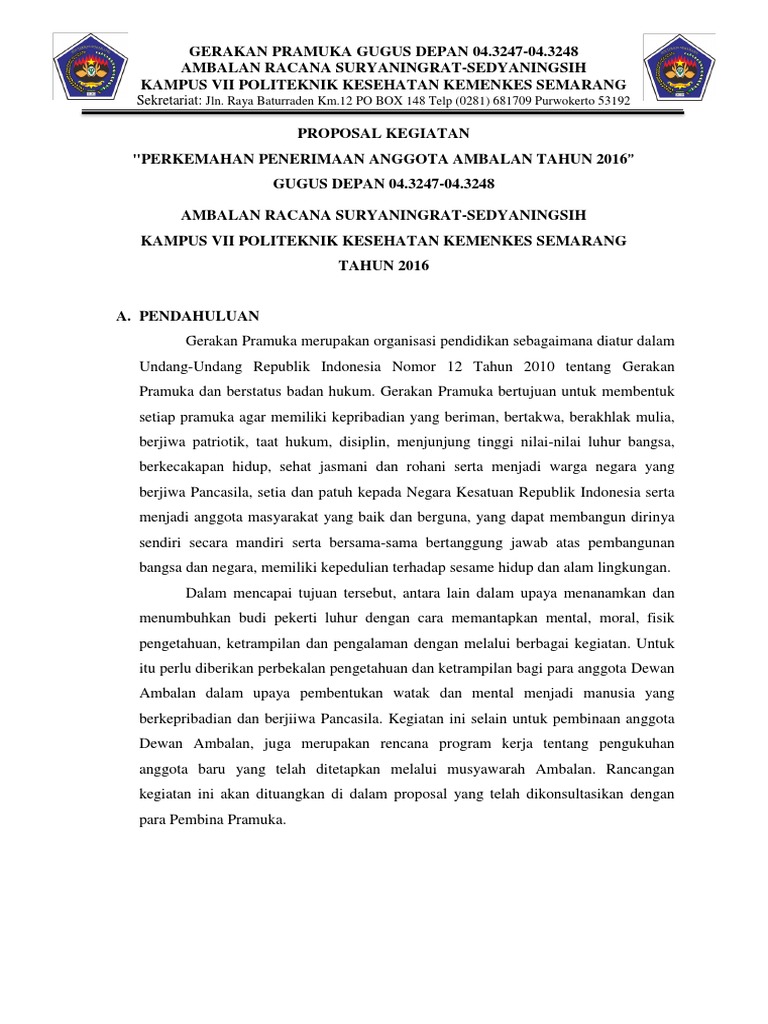 Selain itu dalam pramuka juga dikenal dengan adanya kerja sama yang baik dalam tim. Penyelesaian proposal ini tidak lepas dari bantuan dan dorongan dari semua pihak yang berupa moral maupun material. 10.2 bermusyawa rah membuat jadwal latihan lanjut * bermusyawarah membuat jadwal latihan. Disiplin, setia, dan bersahaja menuju insan berakhlak mulia. Berikut ini infojempol berikan contoh proposal penempuhan dan pelantikan bantara yang baik dan benar.
