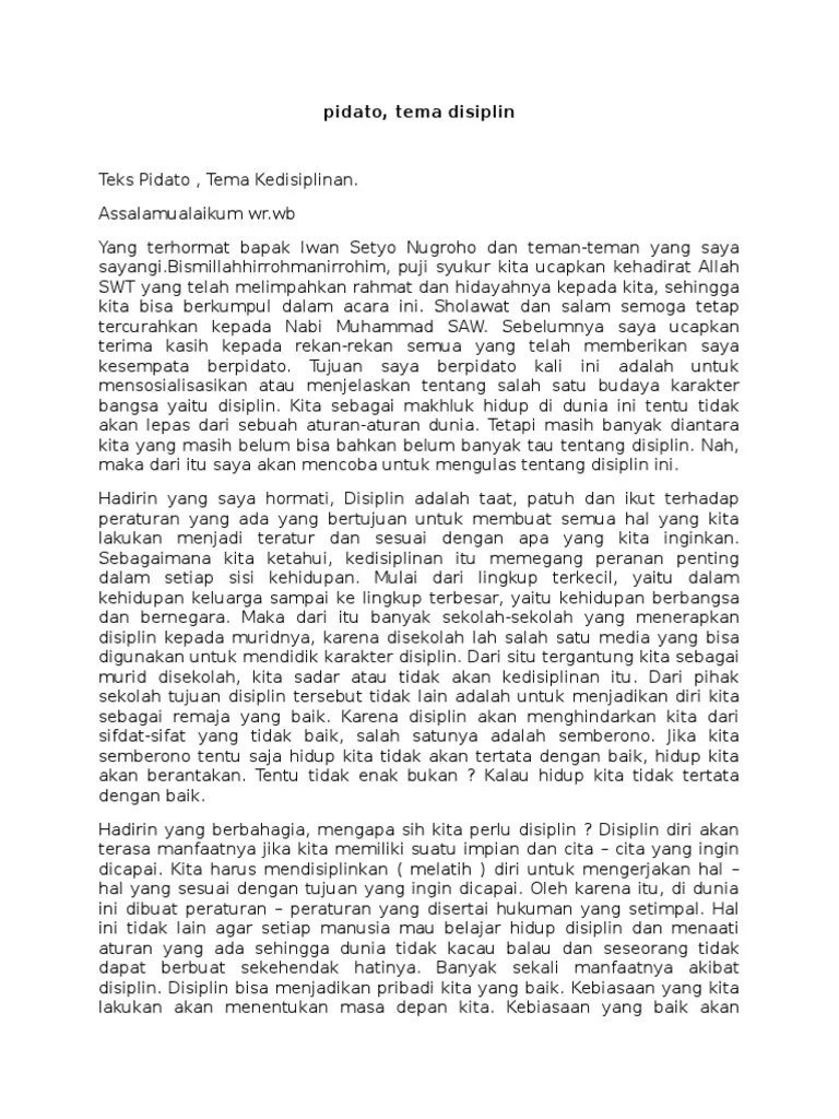 Teks Pidato Tentang Kedisiplinan / Contoh Pembukaan Pidato Kedisiplinan : pidato upacara bendera tentang kedisiplinan adalah contoh teks/naskah pidato umum menggunakan bahasa indonesia.. Yang penting dan harus tetap diingat adalah susunan dari naskah atau teks pidato singkat tersebut. teks tantangan pengertian struktur contoh teks tantangan. kedisiplinan adalah kunci utama kesuksesan dalam hidup ini, jika kita ingin sukses sikap kedisiplinan harus dimulai dari diri kita sendiri sejak dini. Bagian ini terdapat di awal pidato bisa berisi salam dan sambutan. الحمد لله رب العامين وبه نستعين على امور الدنيا والدين والصلاة والسلام على اشرف المرسلين سيدنا.